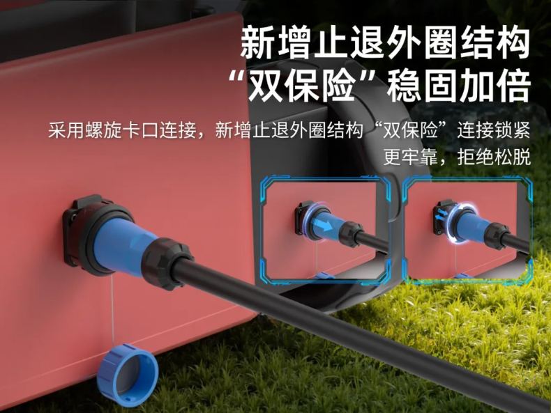 市面上某些大電流連接器,僅滿足了大電流與快充而已,其實(shí)“安全性”才是用戶安心使用的壓艙石。對(duì)于大電流、強(qiáng)高壓的割草機(jī)快充,存在兩大安全隱患:連接部位松脫導(dǎo)致帶電端子暴露和誤觸高壓導(dǎo)電部位。