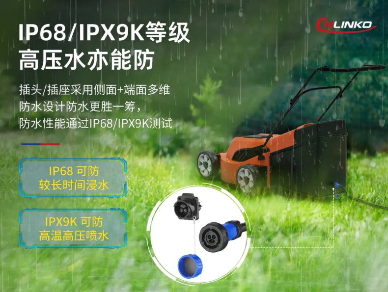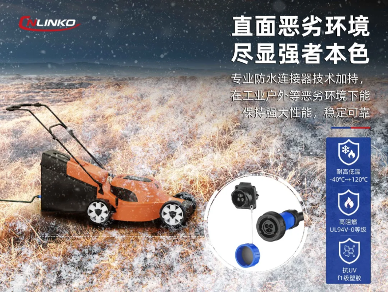 割草機(jī)充電連接器面臨多重環(huán)境威脅。主要為①戶外移動(dòng)充電:雨水/露水侵蝕;②設(shè)備清洗維護(hù):高壓水霧沖擊;③作業(yè)殘留物:粉塵侵入。